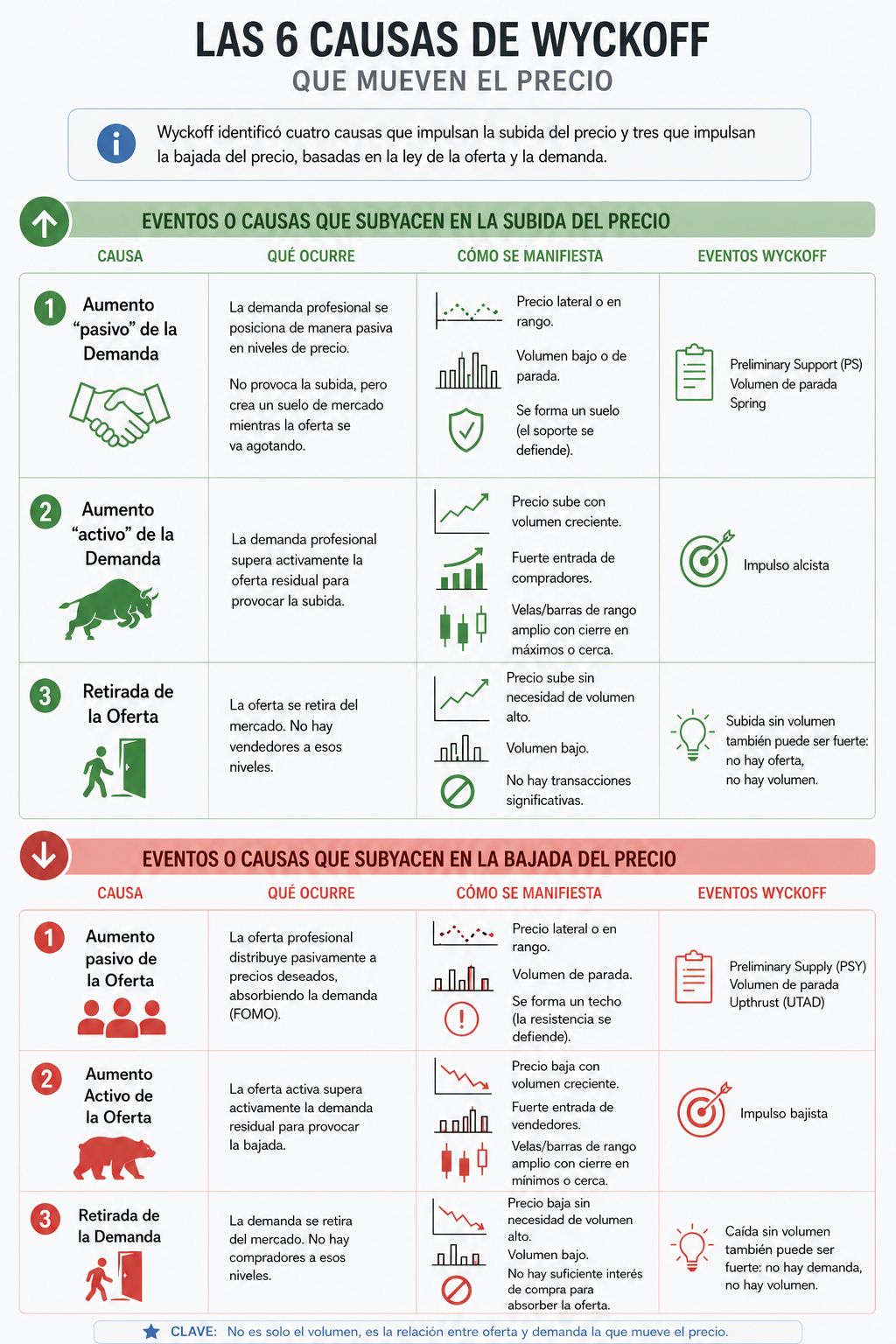 Wyckoff identificó seis condicionantes y causas que condicionan y/o impulsan el movimiento del precio, basadas en la ley de la oferta y la demanda, cada una con su propia huella en el precio y el volumen. Comprender estas causas es clave para cualquier operador que desee aplicar la Metodología Wyckoff con éxito. Estas seis causas y/o condicionantes son: