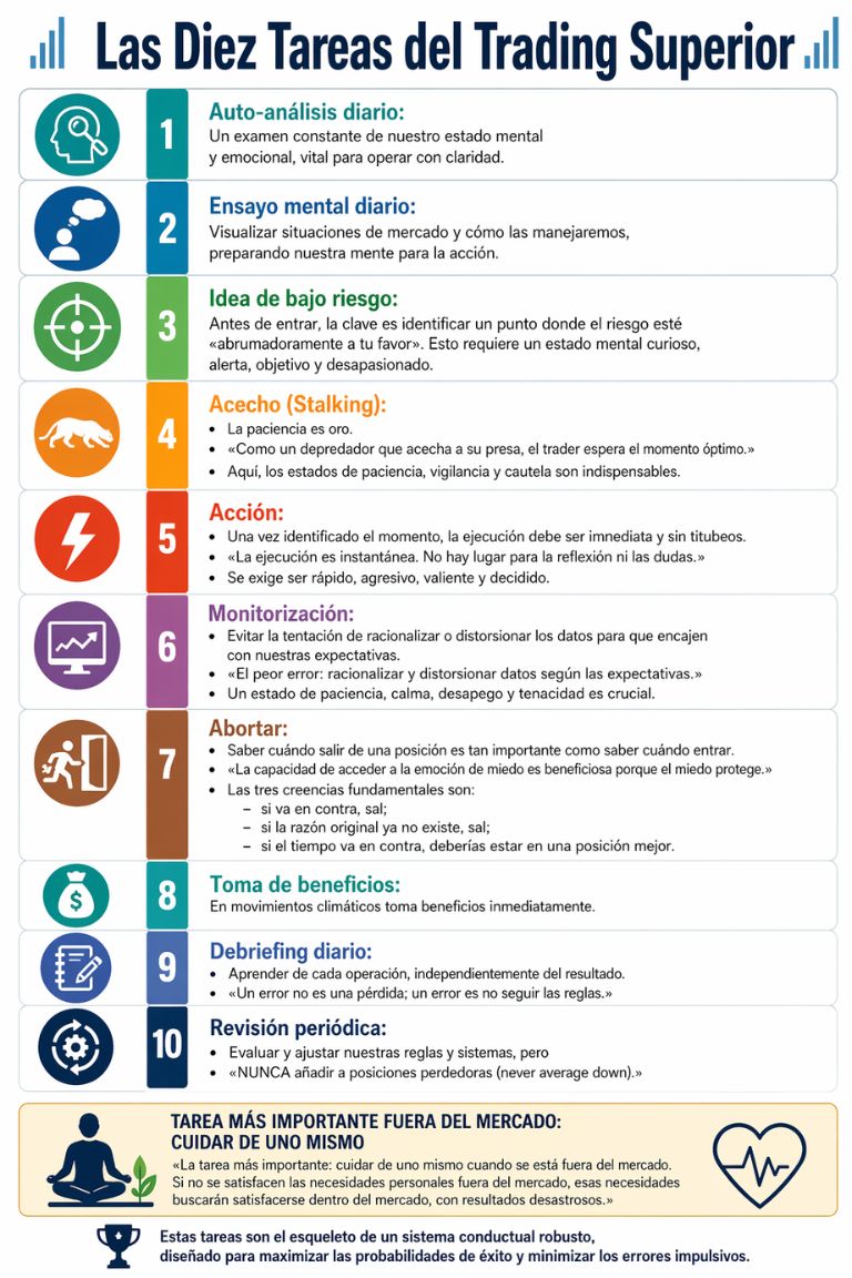 Para Pruden, estas pautas de comportamiento se materializan en 'Las Diez Tareas del Trading Superior', una hoja de ruta práctica para cualquier operador: